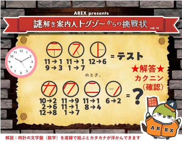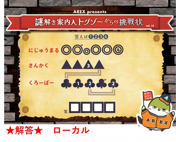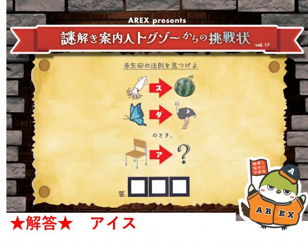※AREX presents「謎解き案内人トグゾーからの挑戦状」の解答は、「AREX Faces」の写真をご覧ください。 No13から掲載